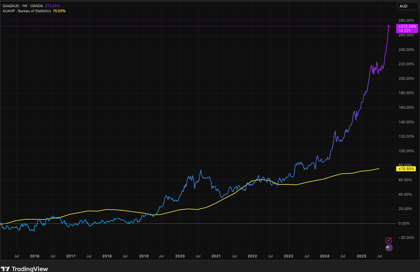 If we assume a $100,000 investment in gold 10 years ago and $100,000 into an average Australian house (average across all cities) with 80% gearing, the capital gain on gold would be worth around $270,000 while the equity on property is worth around $375,000. Mostly because of gearing.