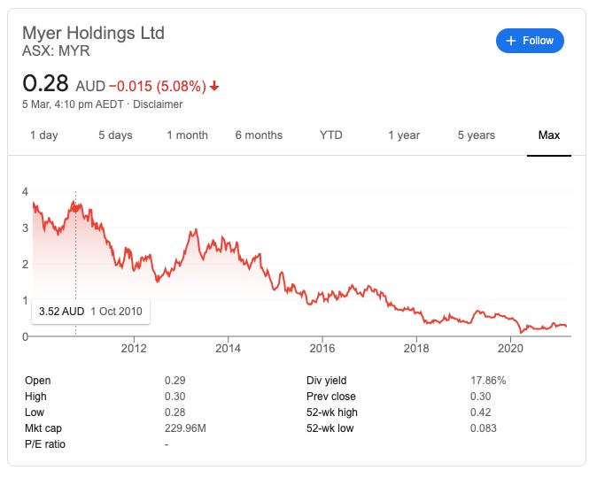 In 2009 I told investors to avoid Myer on its IPO when the everybody else “loved it”. I repeated my view publicly for the next 5 years. The Myer stock price fell from its $4.10 IPO price to $0.28 at the time of writing.