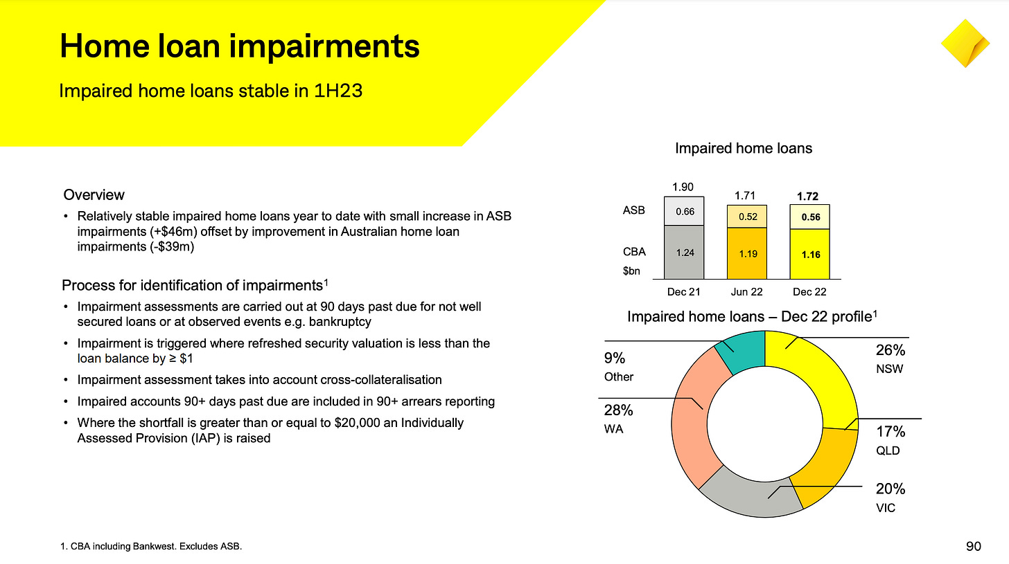 Commonwealth Bank’s recent earnings report disclosures showed impaired loans are at very comfortable levels despite 9 consecutive interest rate rises. There’s no significant pain at the moment.