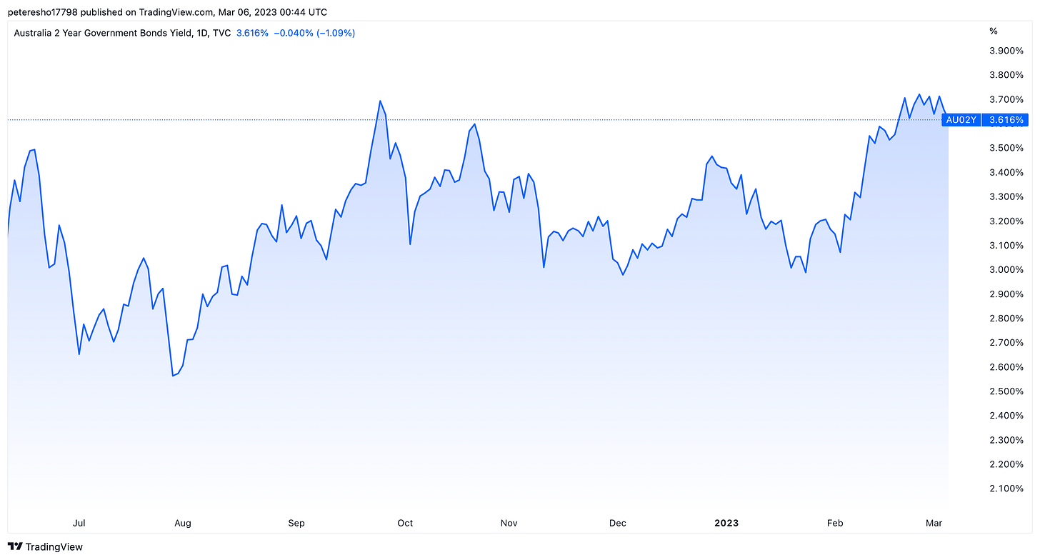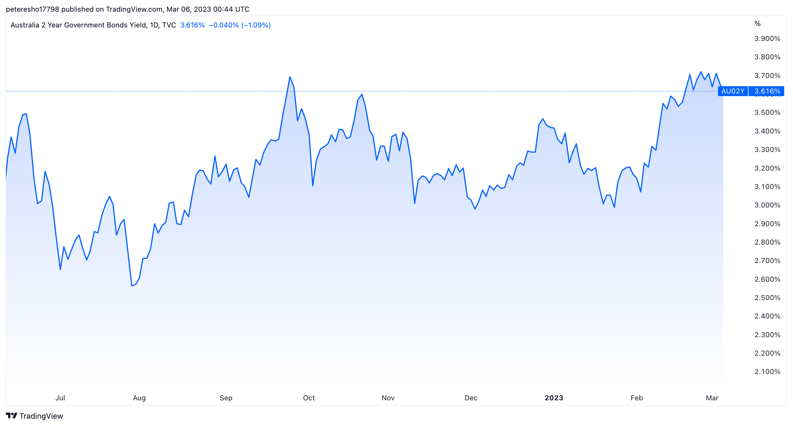 The bond market supports this view. Yields on 2 year Aussie bonds have hit their triple top cap of 3.65-3.7% and come off again. A sign that we may have peaked for the time being.